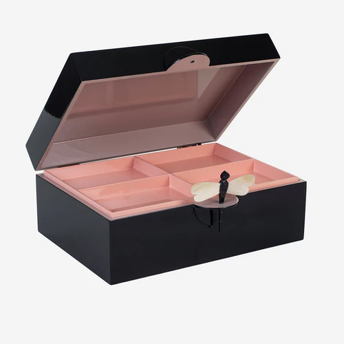 Lackdose mit einer Libelle aus Büffelhorn. Hergestellt aus MDF-Holz mit 13–15 Lackschichten. Außen schwarz, innen Kaschmir.