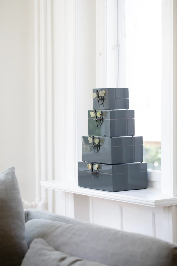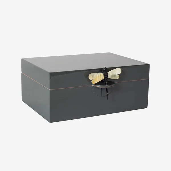 Lackdose mit einer Libelle aus Büffelhorn. Hergestellt aus MDF-Holz mit 13-15 Lackschichten.Außen kohle, innen schiefer