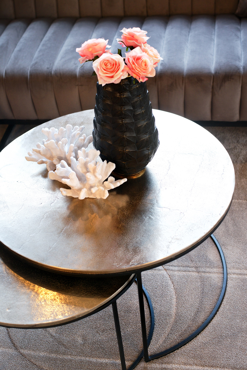 Der Asher Tisch ist ein elegantes 2er-Set Couch- bzw. Beistelltisch mit runden Aluminiumplatten in Champagner-Gold und schwarzen Eisen-Gestellen, die zusammen oder getrennt gestellt werden können und ein modernes, luxuriöses Design mit klaren Linien bieten. Ideal für zeitgenössische Wohnstile, wobei der größere Tisch etwa 82x47 cm und der kleinere etwa 61x41 cm misst.