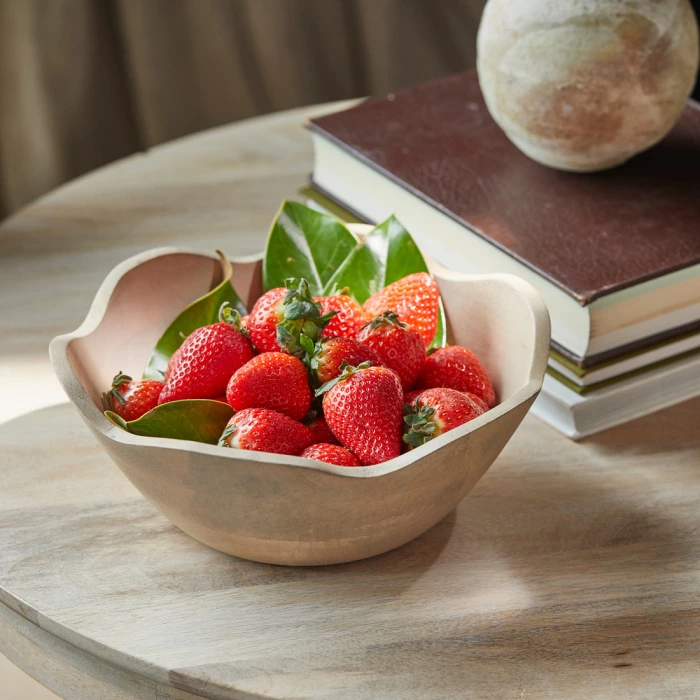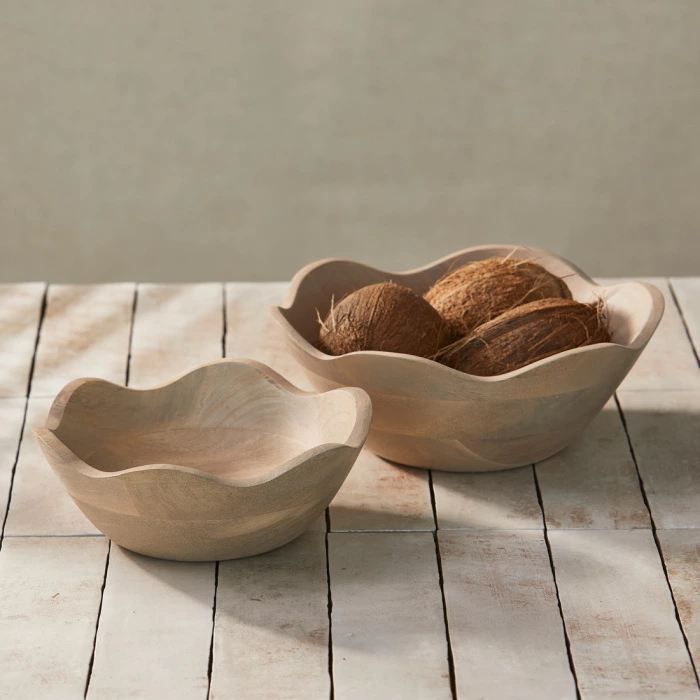 Setze einen einzigartigen Akzent auf deinem Tisch mit den Navelli-Schalen. Das gewellte Design aus Mangoholz schafft einen raffinierten Look, während der natürliche Charme des Holzes eine warme Atmosphäre in dein Zuhause bringt. Perfekt zum Servieren von Köstlichkeiten oder als stilvolle Dekoration.