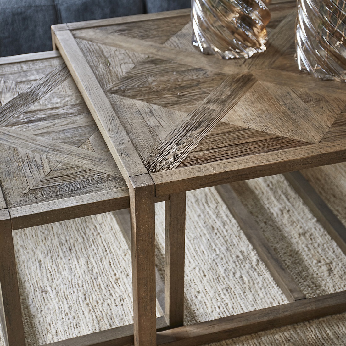 Das Tischset ist aus altem Eichenholz gefertigt und hat mit dem Fischgrätenmuster eine schicke Ausstrahlung. Der größte Tisch ist quadratisch mit 80x80cm. Die kleineren Tische passen genau unter ihn. Das Tischset ist so konzipiert, dass Sie es zusammen, aber auch einzeln verwenden können, so dass Sie Ihre eigene gewünschte Anordnung machen können.