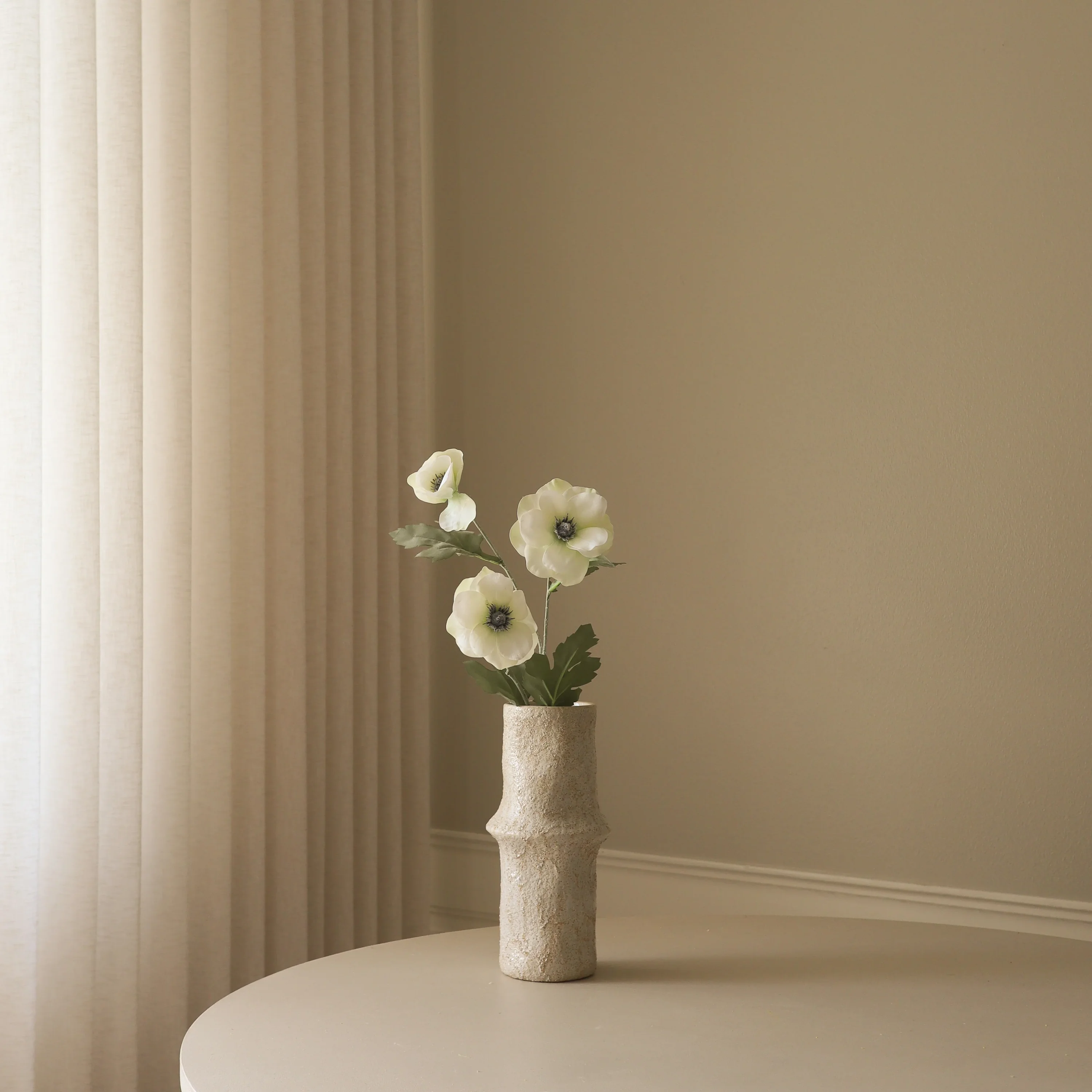 Diese weiße Anemone ähnelt frisch blühenden Anemonen. Am Stängel befinden sich drei Blütenköpfe mit weichen, elfenbeinfarbenen Blütenblättern, die dunkle Blütenzentren umgeben, sowie strukturierte grüne Blätter. Der schlanke grüne Stängel ist 70 cm hoch.
