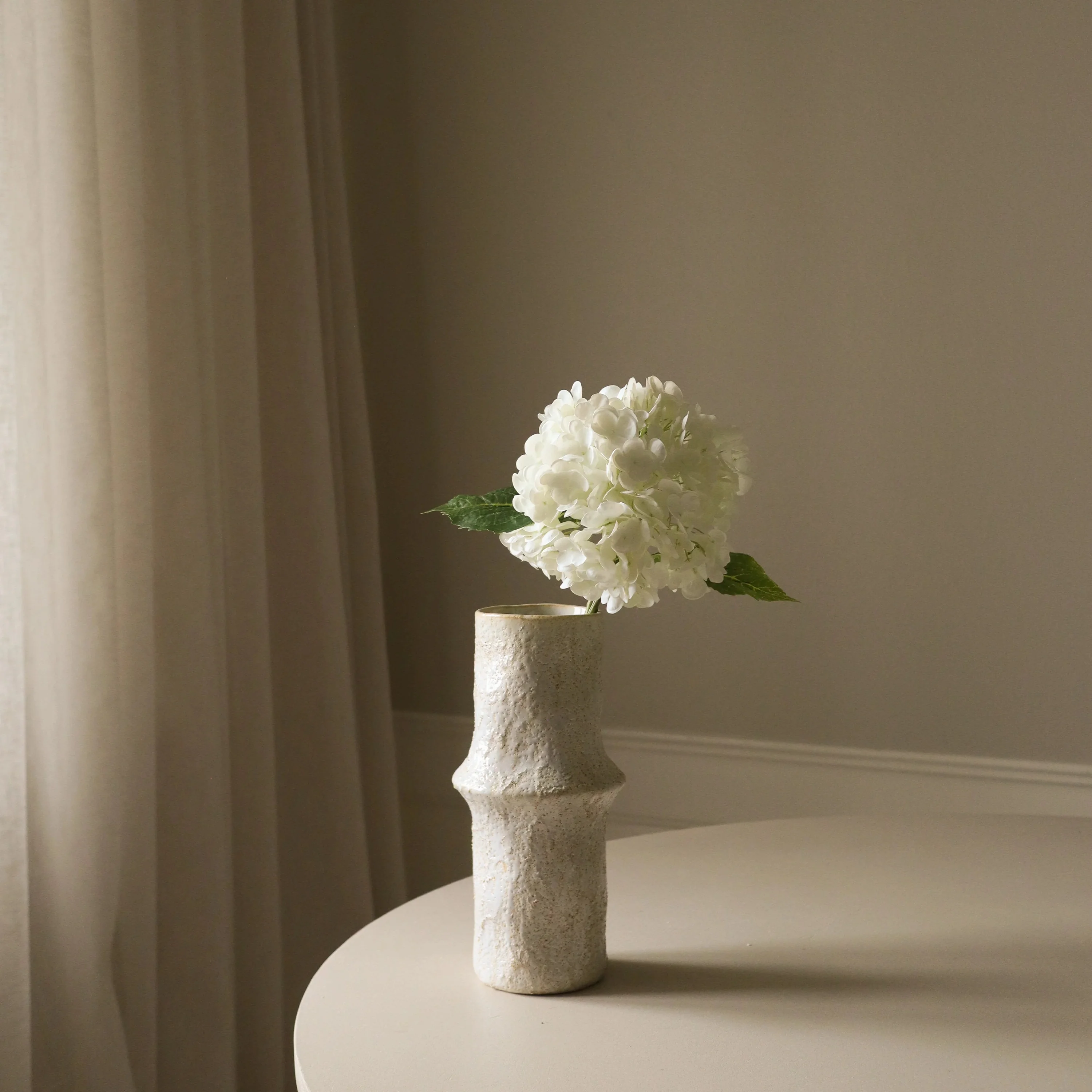 Diese weiße Hortensie zeichnet sich durch eine einzelne große Blüte aus, die aus zahlreichen weichen, runden Blütenblättern in einem reinen Weißton besteht. Der volle, buschige Blütenkopf wird von zwei strukturierten grünen Blättern begleitet, die einen schönen Kontrast zu den glatten Blütenblättern bilden.