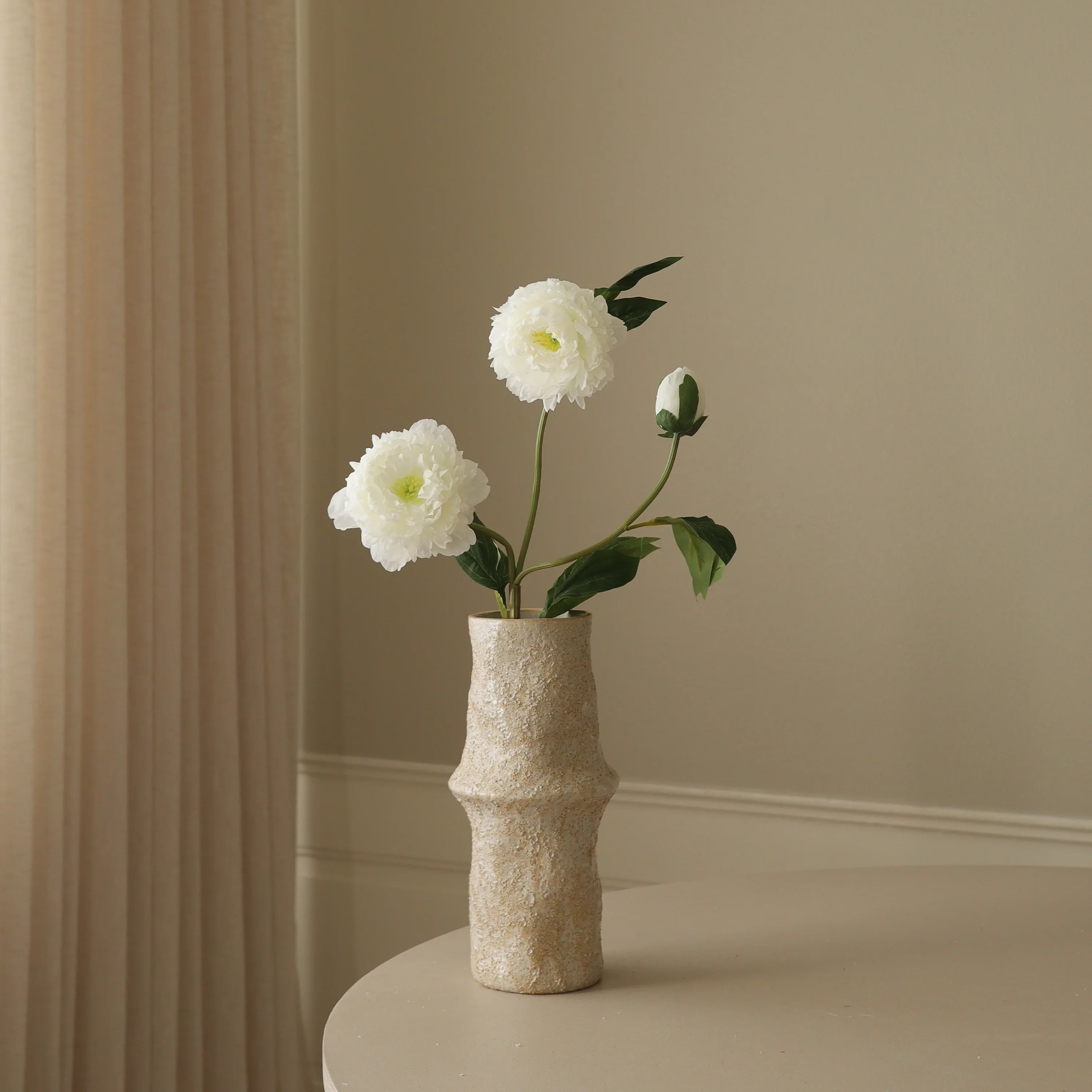 Diese weiße Pfingstrose besticht durch zwei voll erblühte Blüten mit zartweißen, gewellten Blütenblättern, die ein hellgelbes Zentrum umgeben. Eine einzelne, halb geschlossene Knospe sitzt an einem separaten Stiel. Die schlanken, grünen Stiele wachsen leicht gebogen nach oben und tragen breite, spitz zulaufende Blätter in einem tiefen Grün. Die Blüte erreicht eine Höhe von 72 cm.
