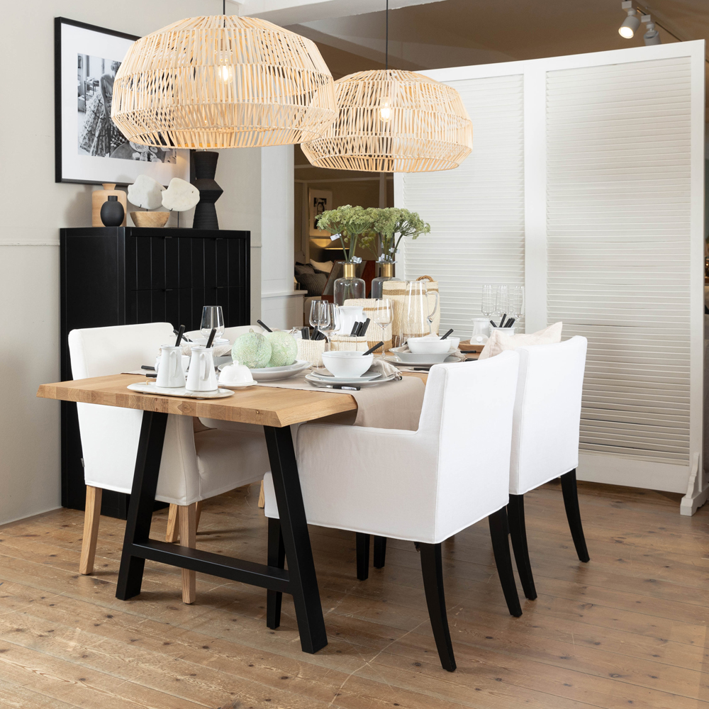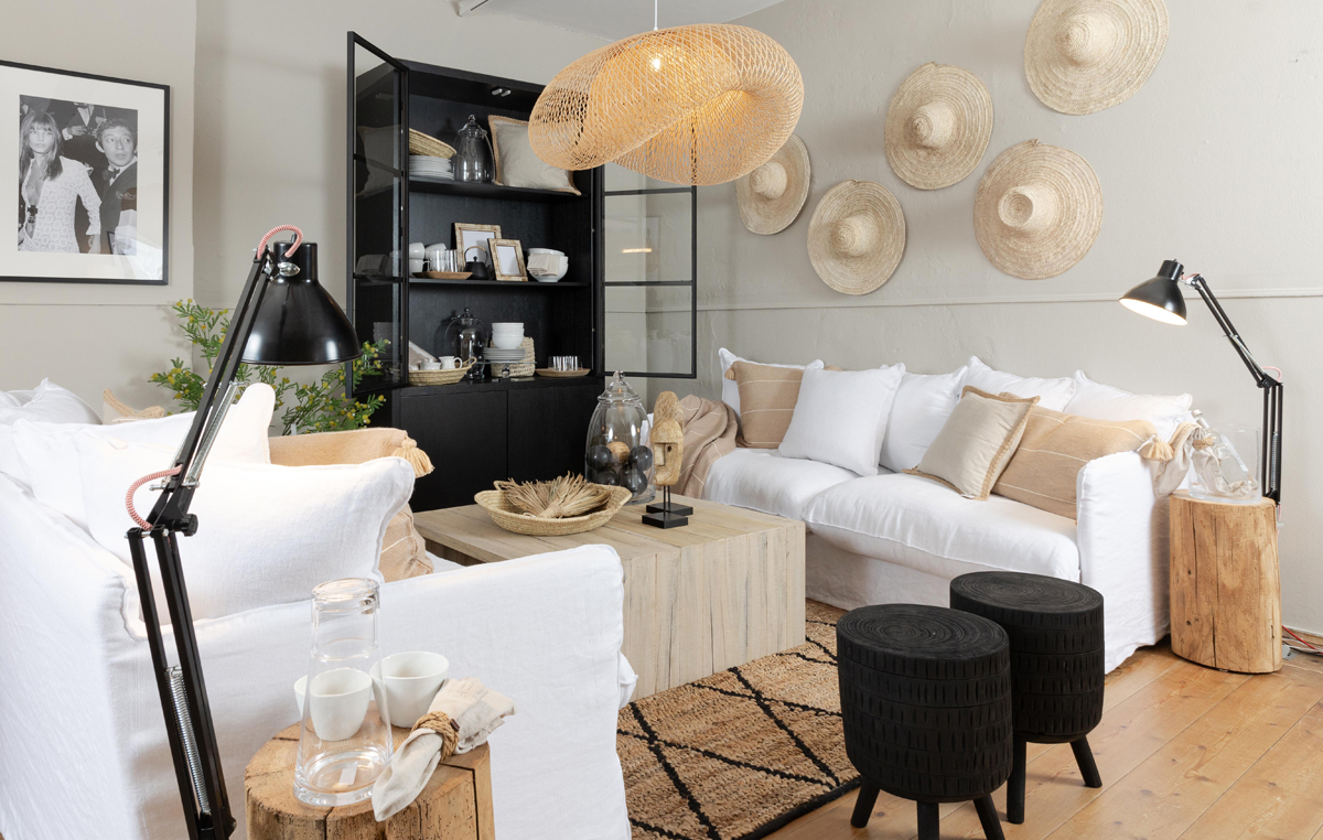 Verleihen Sie Ihren Wohnräumen eine moderne Leichtigkeit. Dieses Wohnbeispiel zeichnet sich durch seine mordernen schwarzen Highlights aus, welche mit seichten Farbtönen in Einklang gebracht werden. Die Details aus Rattan und Bast, verleihen Ihrem Wohnraum eine sommerliche Atmosphäre, welche zum Entspannen einlädt.