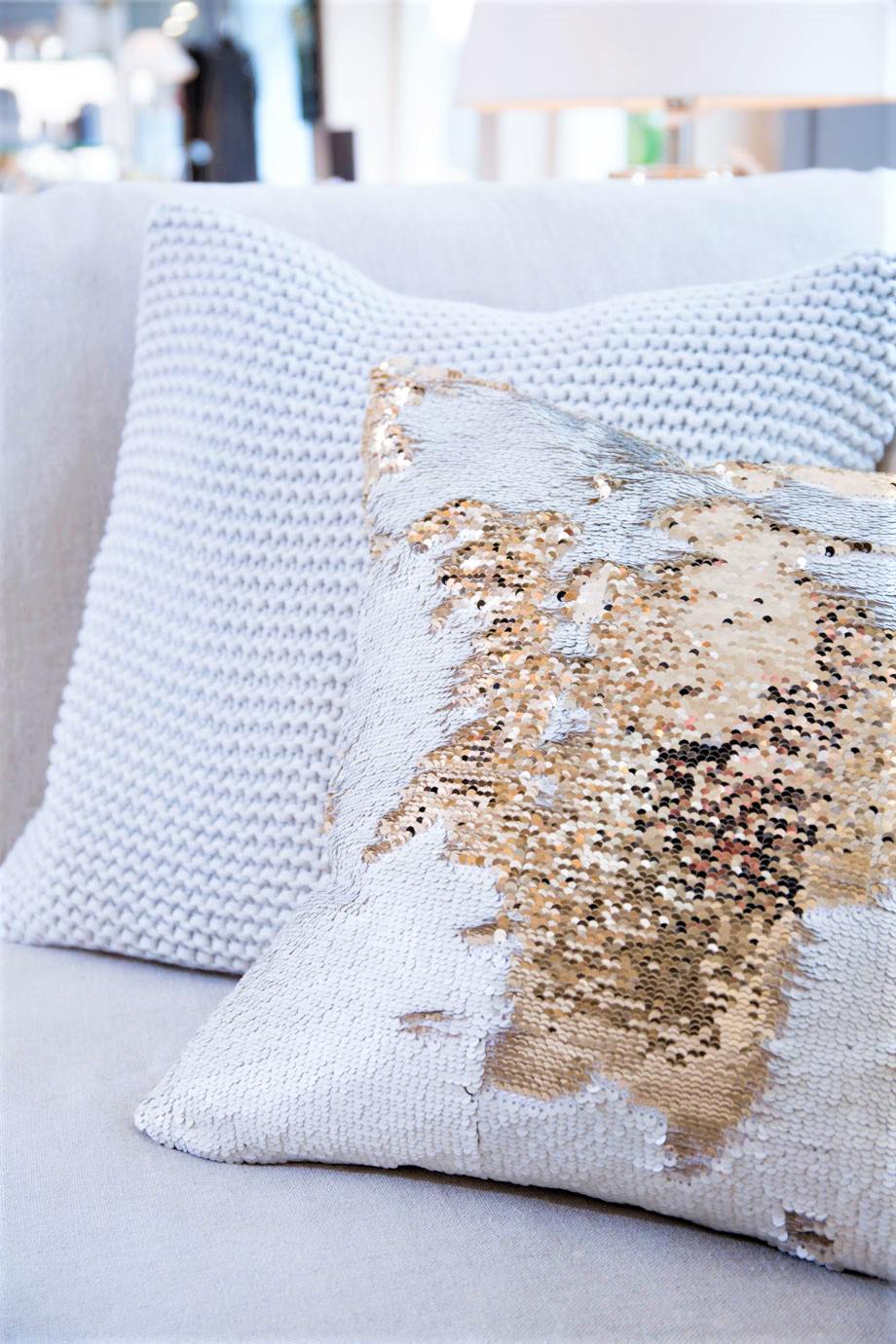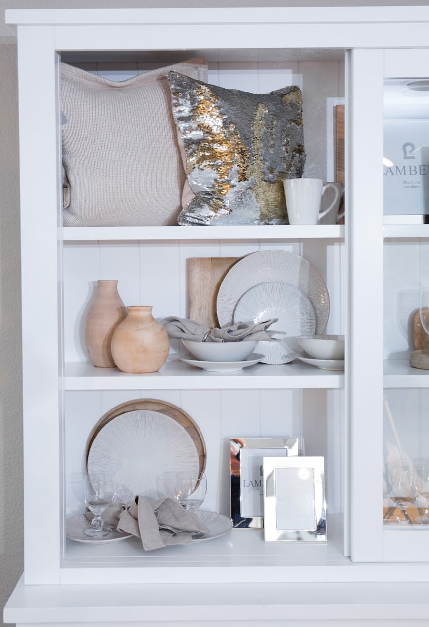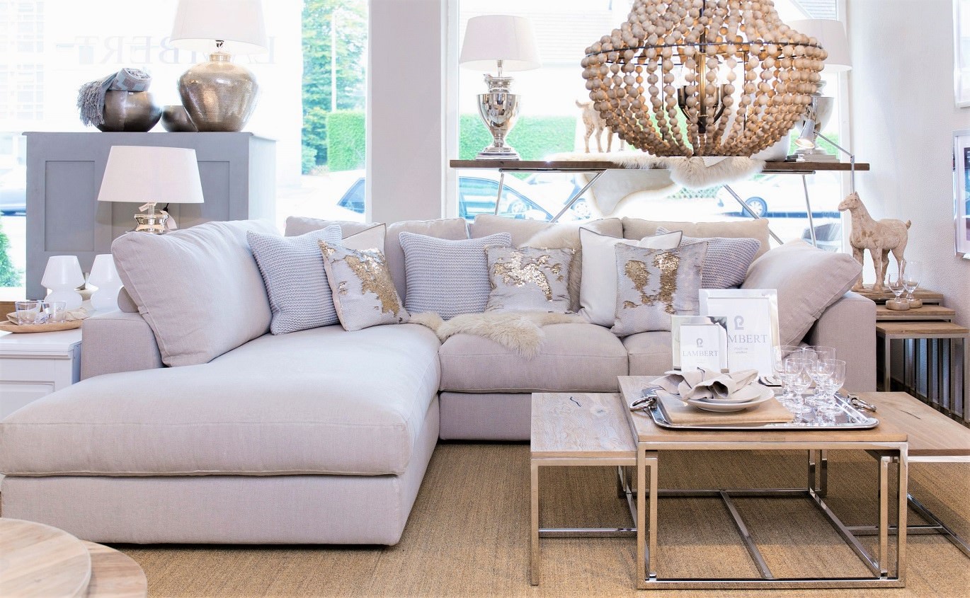 Bringen Sie mit einem extravaganten Leuchter, goldenen Pailletten-Kissen oder auch einem hochwertigen Fell den ganz besonderen Glanz in Ihr Wohnzimmer. In Kombination mit den hellen Polstermöbeln sowie den Edelstahlelementen ergibt sich ein sehr wertiges Gesamtbild, das durch die harmonische Farbgebung unterstrichen wird.