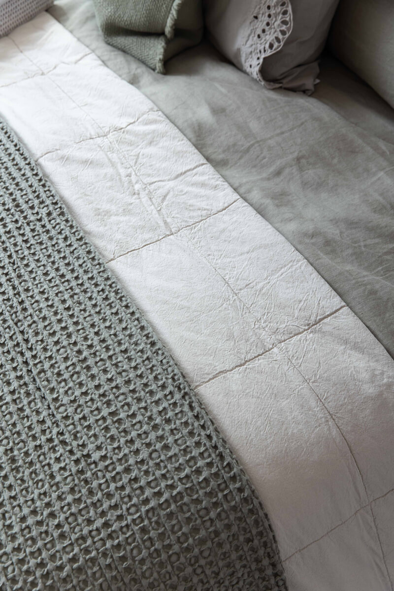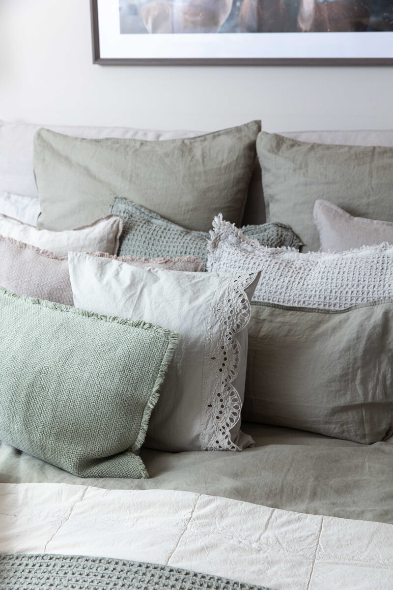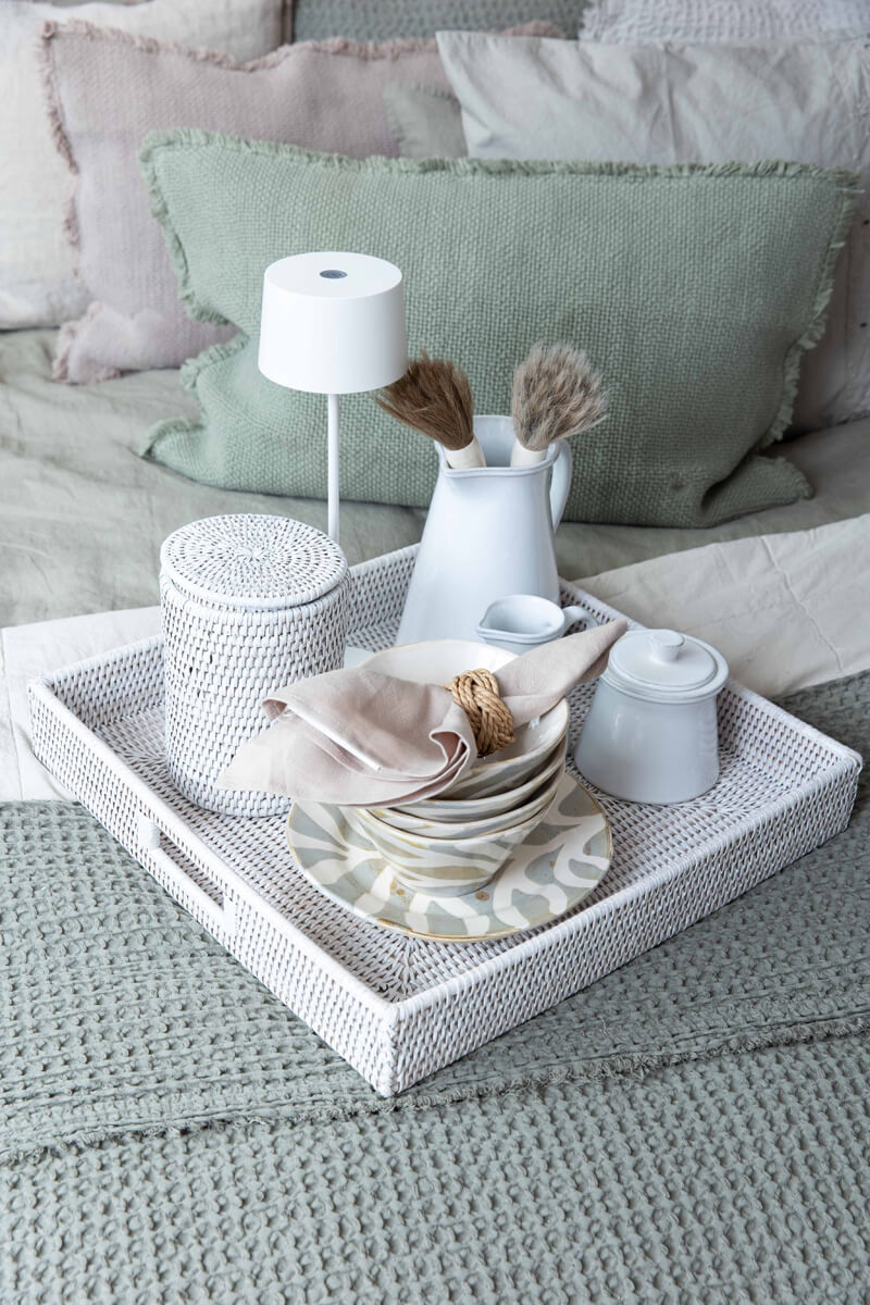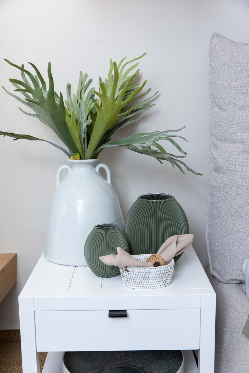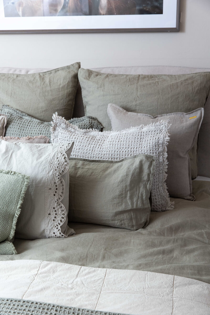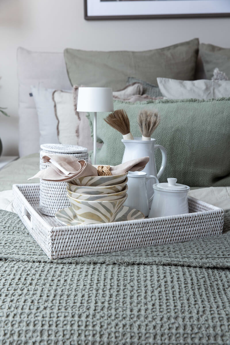 Entspannen Sie in einer Wohlfühlatmosphäre geschaffen durch sanfte Farbtöne wie Salbei, Beige und Weiß. Natürliche Accessoires aus Leinen, Wolle, Rattan und Jute runden den gemütlichen Look ab.